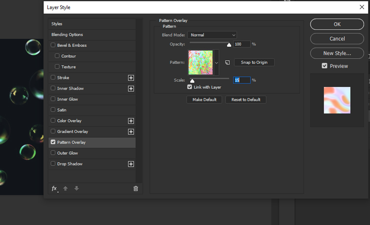 Now we will apply the pattern effect to the bubbles. To do that, you need to select the layer to right-click on the layer with the bubbles and select Blending Options. Then, choose Pattern from the list of blend modes and click OK.